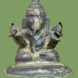 พระพิฆเนศ เทพเจ้าแห่งความสำเร็จ เนื้อเงิน ขนาดหน้าตัก ประมาณ ๒ ซม. ความสูง ประมาณ ๓ ซม. หนักประมาณ ๑๑ กรัม งานเก่า คลาสสิค บล็อคปะกบข้าง เชื่อมต่อกับฐาน ( โขว์ )
